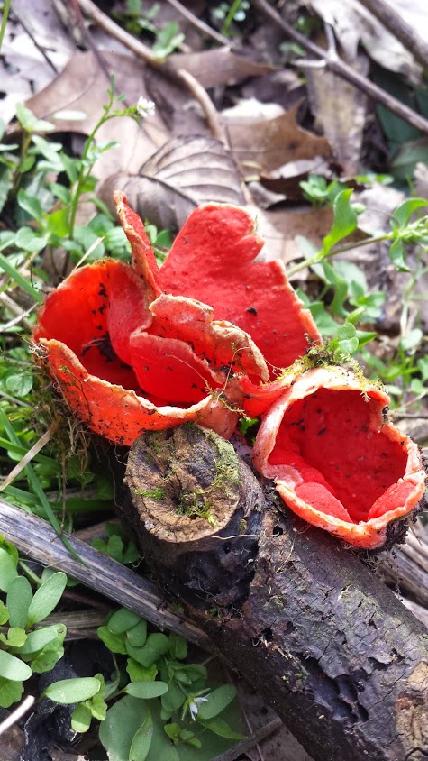 This is the eastern North America variety of the Sarcoscypha. It is both easy and difficult to find. It is easy because it is the only thing with color in the spring forest, however it is also very difficult to find because it is usually buried under the leaf litter from the fall season. I found these at the base of a hill near a stream on moss covered wood.