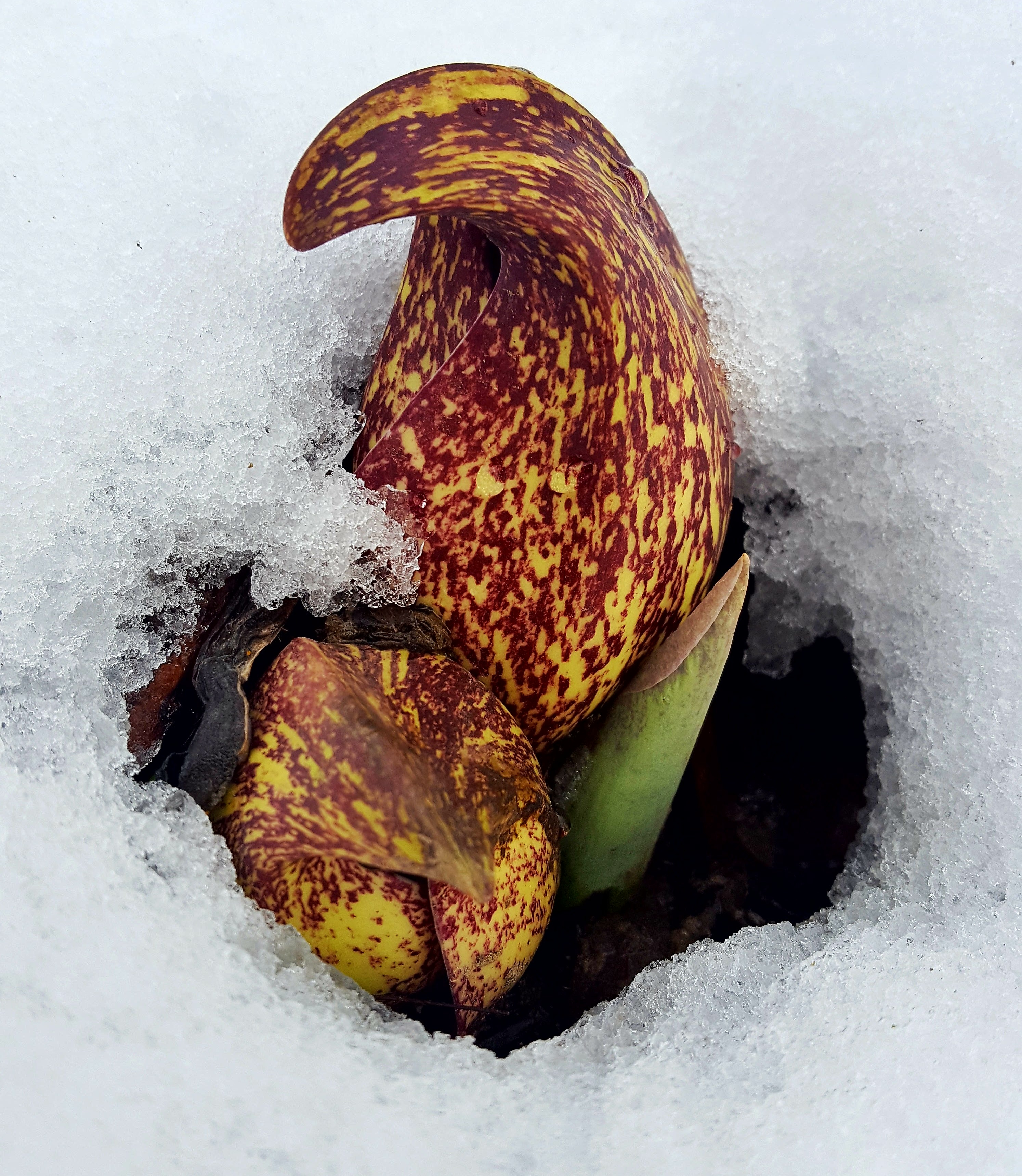 As if it wants to be the center of attention, this plant – The Skunk Cabbage Plant (Symplocarpus foetidus) – heats itself up (thermogenesis) and neatly melts the snow around it revealing its shades of purple, red, yellow and orange. Yes, the blossoms smell like a skunk. The heat that the plant generates actually amplifies the plant’s odor in order to support the pollination process. It was quite pungent. My goal was not to experience this affront to my olfactory nerve, but rather it was to document a fleeting late-winter flower.